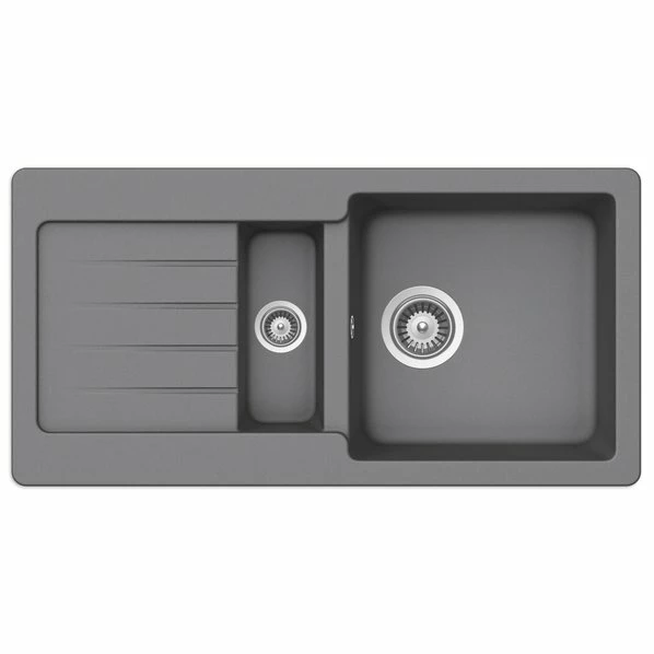 Ein Traum in Grau mit Edelstahl Highlights bei den Korbventilen machen diese eigentlich dezente Spüle zu einem modernen Hingucker. Aufgeteilt in großes Spülbecken und ein Restebecken mit Abtropfbereich wirkt sie wie eine Luxusspüle, die viel Platz benötigt. dank der Tiefe von 43,5 cm passt diese Einbauspüle aber sehr gut auch in kleine Küchen, die über eine schmale Arbeitsplatte verfügen. Auf Ausstattung muss aber nicht verzichtet werden, denn dank des Einsatzes von Cristalite® ist Ihr neuer Begleiter robust, geruchneutral und farbresistent.