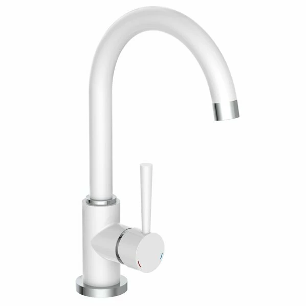 Die weiße Hochdruck-Küchenarmatur lässt sich dank ihres Designs und der Farbgebung mit sämtlichen Einrichtungsstilen kombinieren und ist mit einem schwenkbaren Auslauf ausgestattet. Der seitliche Metallgriff verfügt über eine Cool-Start-Funktion, die für eine effiziente Nutzung von Wasser und Energie sorgt.