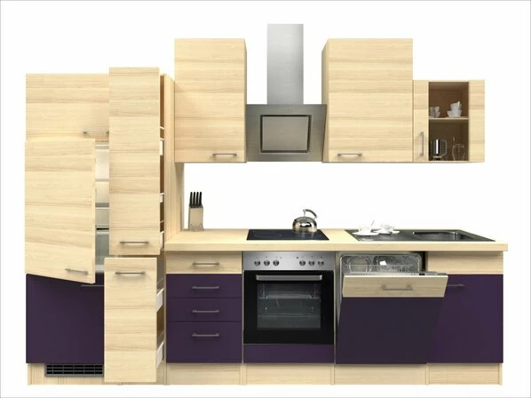 Die Farbkombination aus Aubergine und Akazie Nachbildung macht diesen Küchenblock FOCUS zur modernen Augenweide! Für reichlich Stauraummöglichkeiten sorgen ein Kühlschrankumbau, Apothekerschrank, eine Anrichte und ein Spülenunterschrank. Im oberen Bereich bieten sich insgesamt drei Hängeschränke an, dort Ihr Geschirr und andere Küchenutensilien zu verstauen. Ein Hängeschrank ist mit einer Stollen-Glastür ausgestattet, die für ein optisches Highlight sorgt. Neben den geräumigen Schränken sind im Lieferumfang ein Kühlschrank, ein Einbauherd mit Glaskeramikkochfeld, ein Geschirrspüler und eine Kopffreihaube mit inbegriffen. Diese Küche bringt alles mit, was Ihr Herz begehrt!