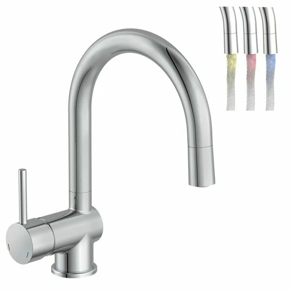 Bogenförmige Küchenarmatur mit LED-Beleuchtung, die je nach Temperatur ihre Farbe wechselt. Je nach Temperatur leuchtet es Blau, Grün oder Rot. Der Aufsatz ist austauschbar, so dass Sie die moderne und formschöne Armatur auch mit einem handelsüblichen Aufsatz benutzen können. Durch einen Kaltwasser-Start bei Griff-Mittelstellung ist die Armatur sehr energiesparend. Mithilfe einer Eco-Kartusche ist sie zudem sehr wassersparend. Bringen Sie jetzt Farbe in Ihre Küche!
