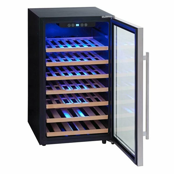 Dieser Weintemperierschrank in Schwarz-Silber eignet sich für alle Weinliebhaber, die ihren Wein in der perfekten Temperatur genießen wollen. In den edlen Holzregalen finden 52 Weinflaschen ihren Platz. Die Temperatur kann nach deinen Wünschen von fünf bis 18 Grad eingestellt werden.
