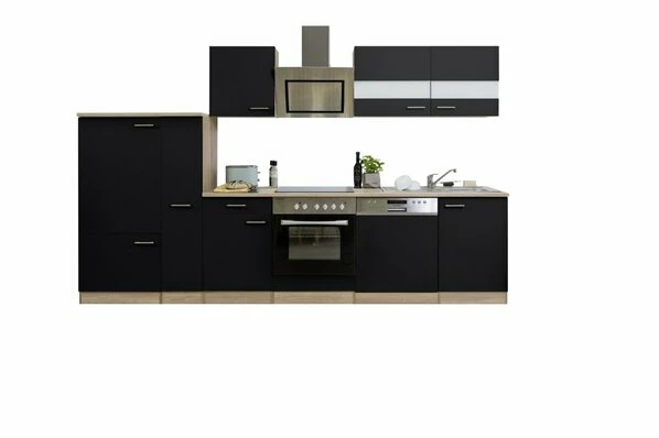 RESPEKTA Küchenzeile – Schwarz – Eiche Sägerau – Mit E-Geräten – 310 Cm